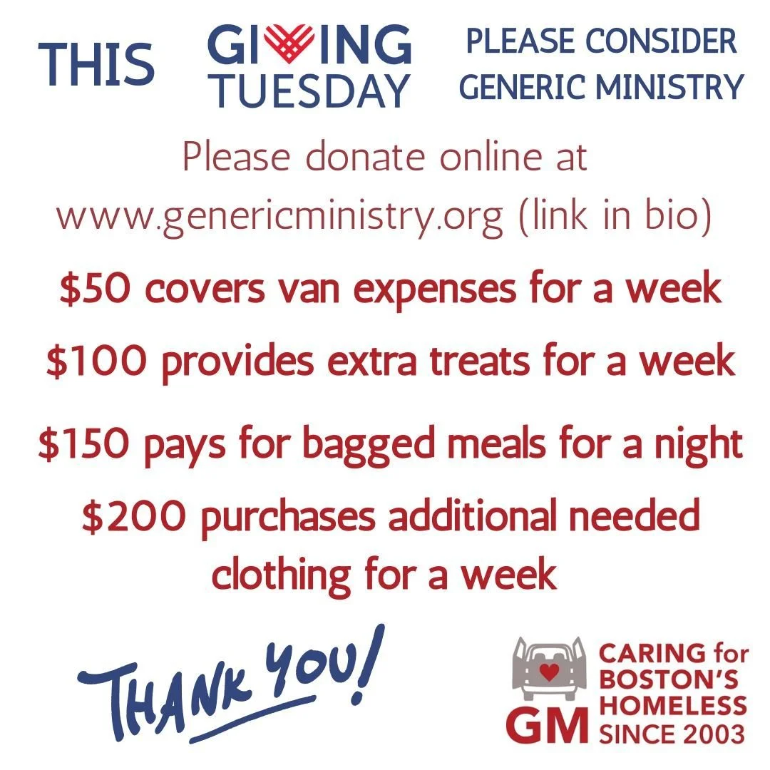 Generic Ministry is a group of volunteers that collects and distributes food, clothing and supplies to people living on the streets in Boston.